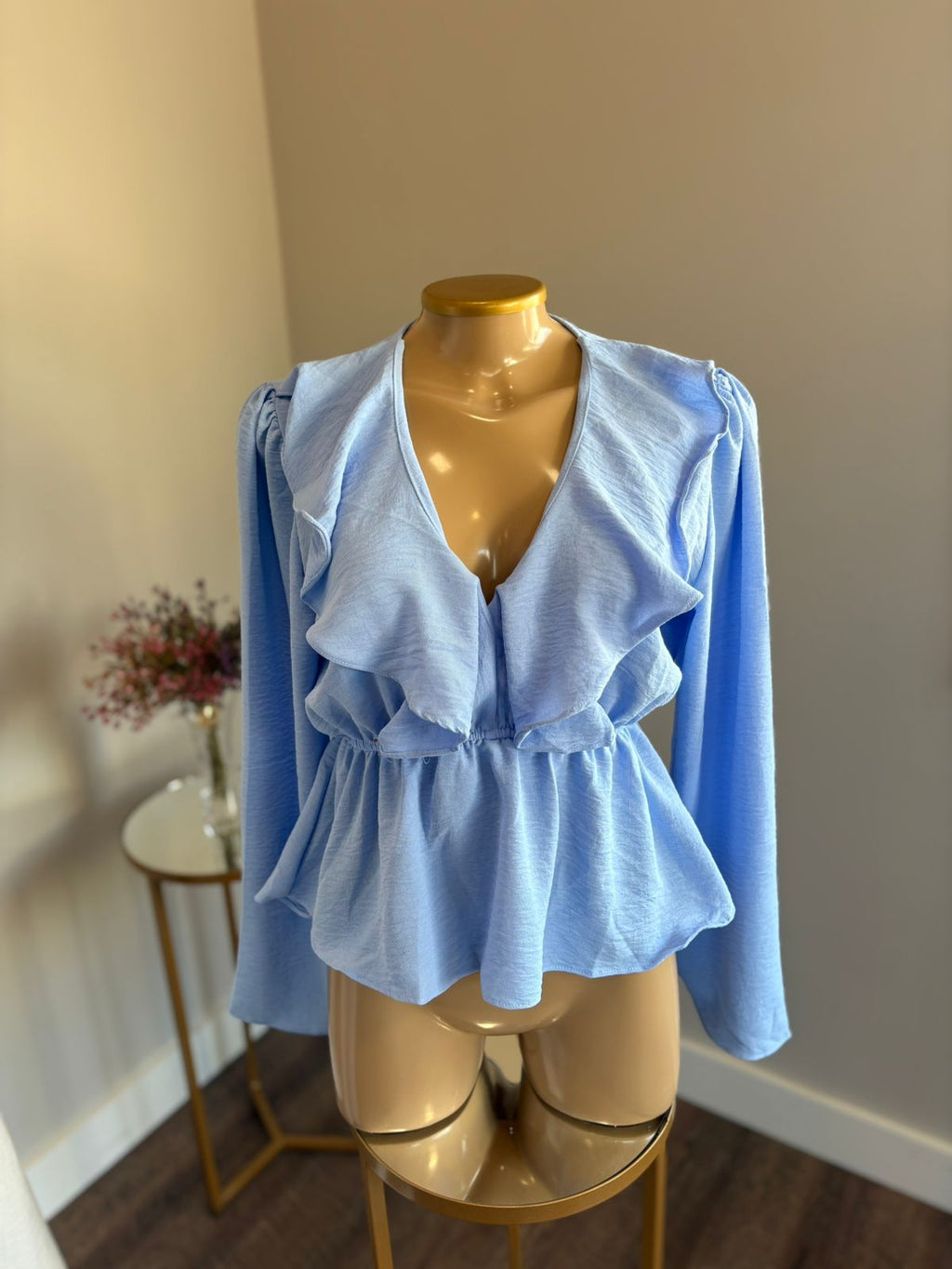 Blusa manga longa, tecido leve com detalhes frontal em babados na cor azul claro, tamanho unico.