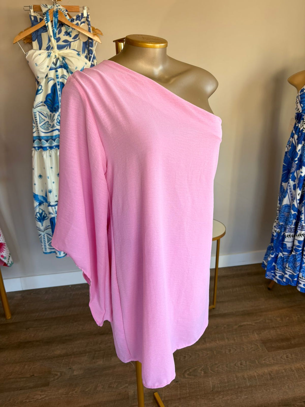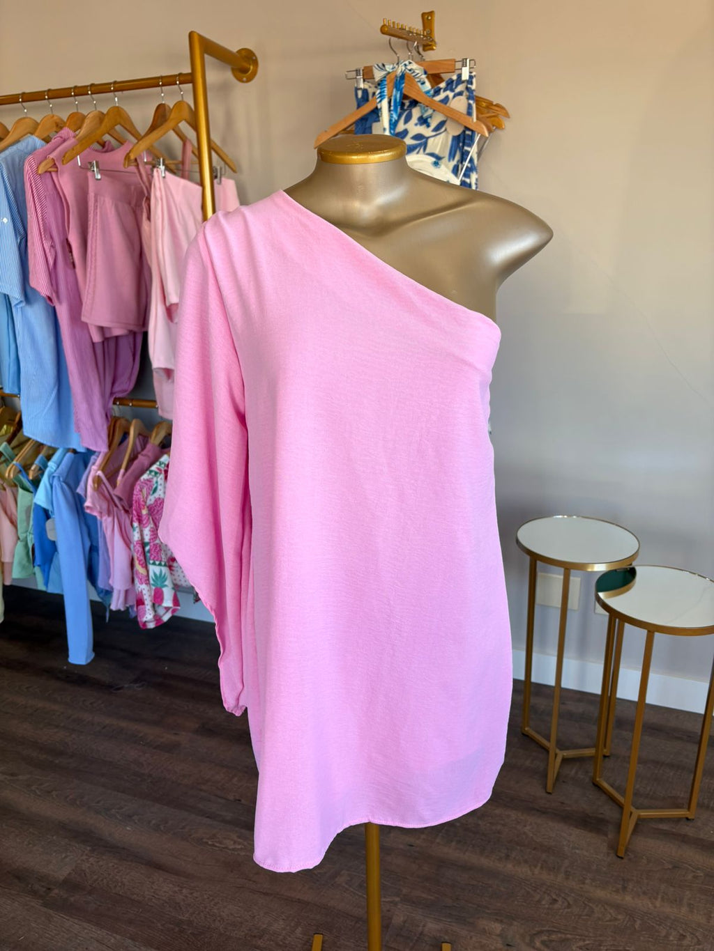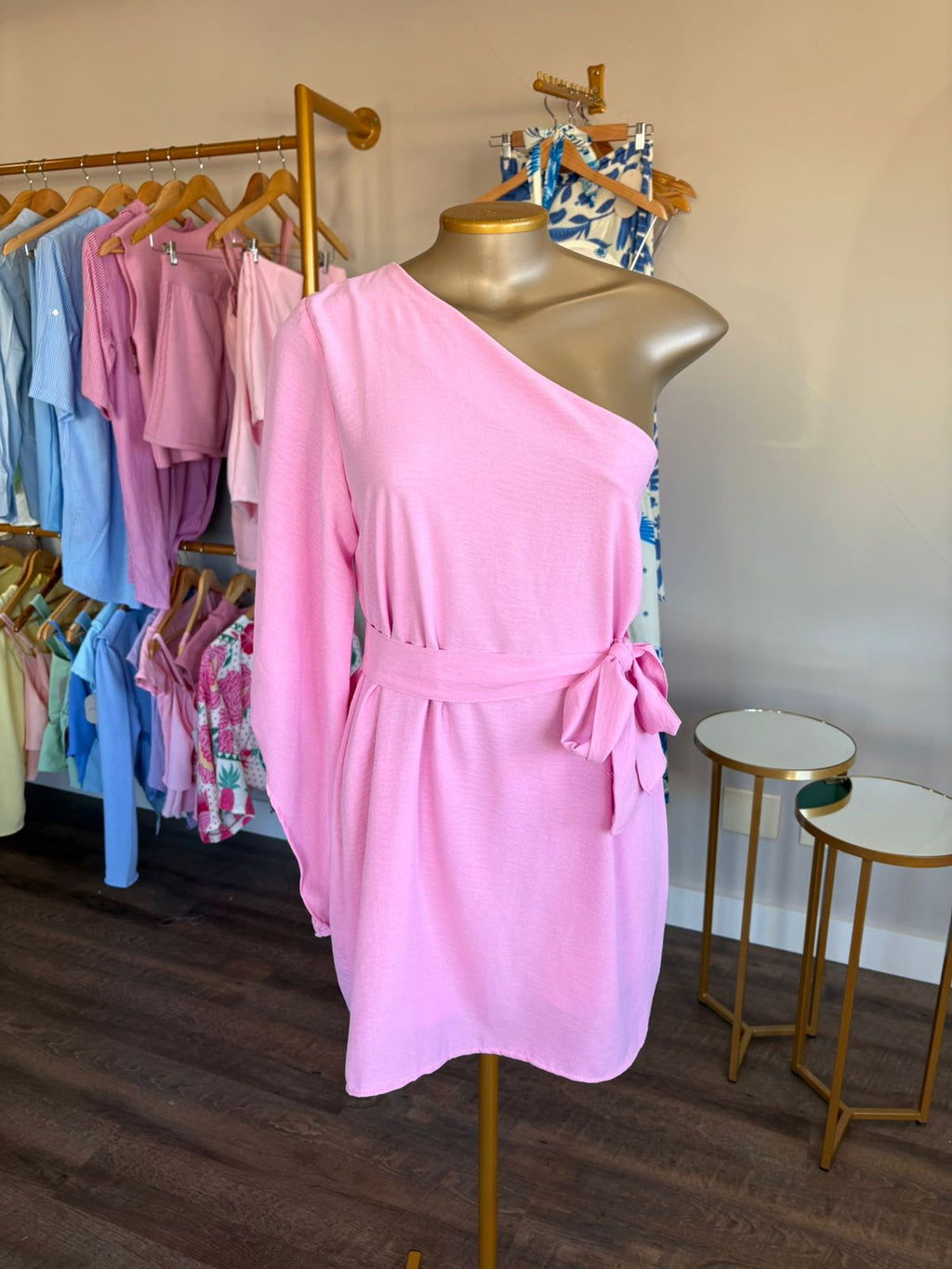 Macaquinho rosa um ombro só, com faixa ajustável na cintura, leve, delicado e sofisticado, tamanho único.