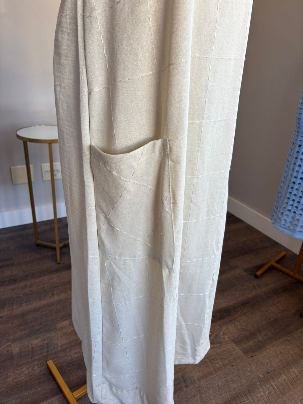 Vestido em linho com bolso nas laterais, com detalhes nas alças.